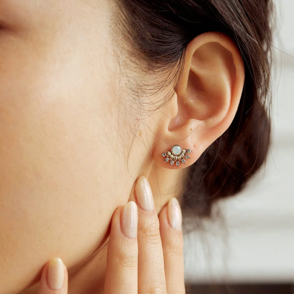 Our Nico Fan earrings are the definition of delicate elegance. These show-stopping studs shimmer enough to catch the light but won't overpower your own sparkle.