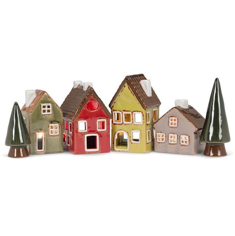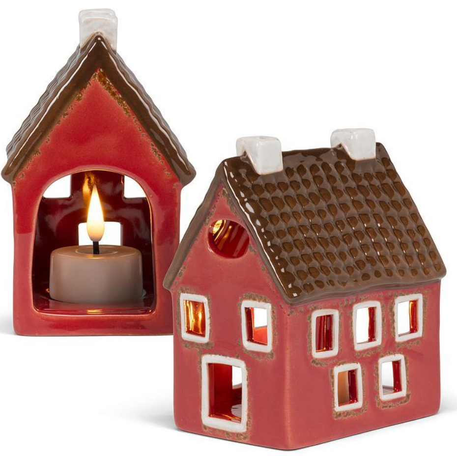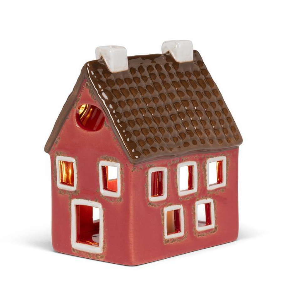 Enhance your miniature village with our Red House featuring windows, a delightful and inviting piece for your collection. Expertly crafted from ceramic, this tealight holder offers a gentle, warm light ideal for adding comfort to any space. Designed specifically for use with LED tealights or light strings, it safely delivers a calming glow throughout your room.