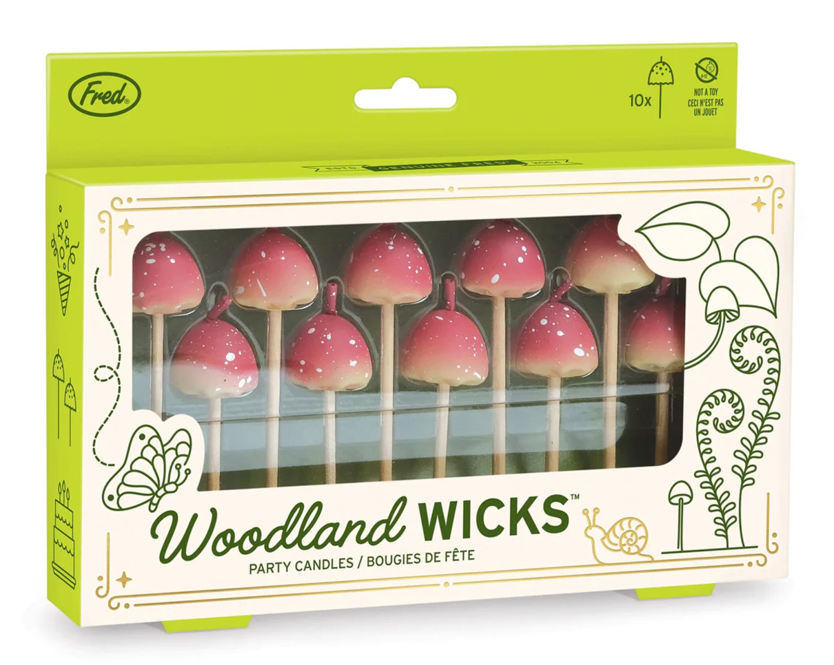 Make your celebratory moments morel magical with Fred’s Woodland Wicks. This set of 10 charming, mushroom-shaped candles will add an enchanting touch to your next party. Includes two sizes, 2" and 2.75" tall. Packed in a gift-ready window box with gold foil details.