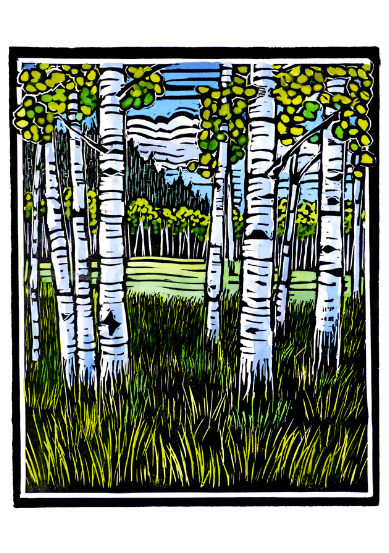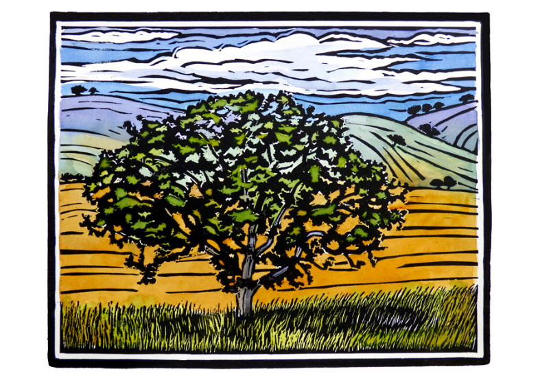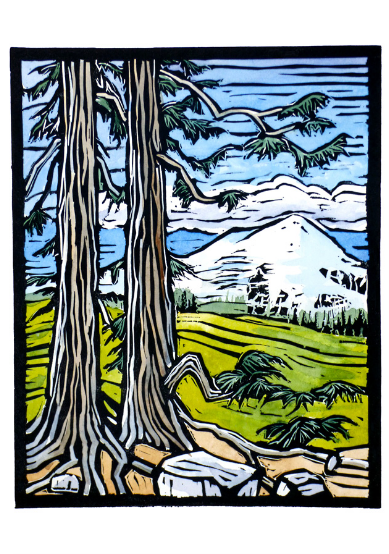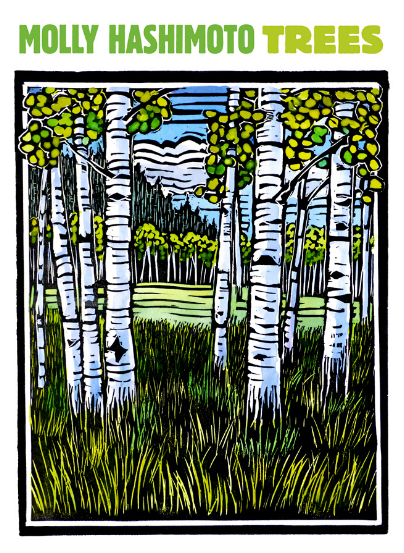 Known for her block prints of birds native to the Pacific Northwest, Molly Hashimoto has created this special collection of works focused solely on trees. Her prints, hand-tinted with watercolour, are crisp and bright portrayals of the nature around her. Her mountainsides, foothills, and meadows bring the viewer amid the trees and into the fresh air.