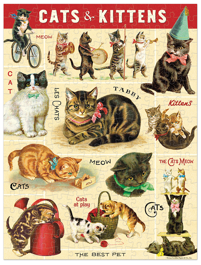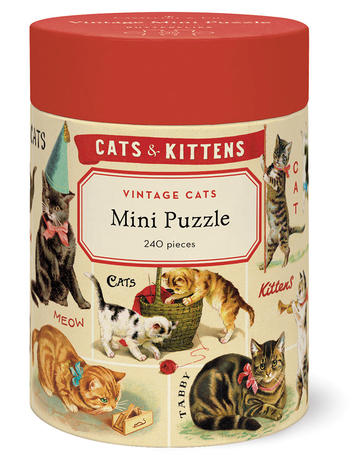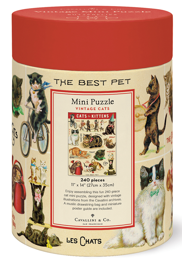 Discover the playfulness of cats with our Vintage Mini 240 Piece Puzzle. Featuring images from the Cavallini archives, this puzzle is packaged in a 5" tube and comes with a biodegradable bag inside. Measuring 10.5" x 14", this puzzle is the perfect way to relax and unwind.