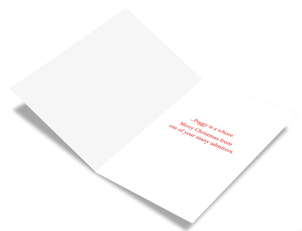 Inside message: ...Peggy Is A Whore. Merry Christmas From One Of Your Many Admirers.