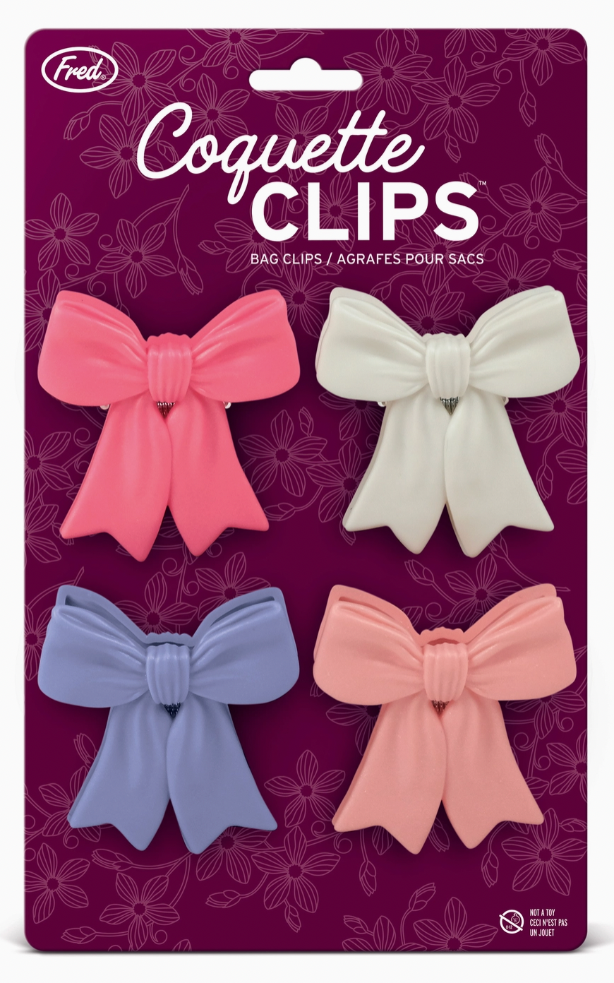 Embrace the sweet side of storage with Fred’s Coquette Clips. These charming double-sided bow bag clips are a pretty way to preserve your snacks while adding a dash of delight to your kitchen. Comes in a set of four shimmering pastel hues Comes in a set of 4.