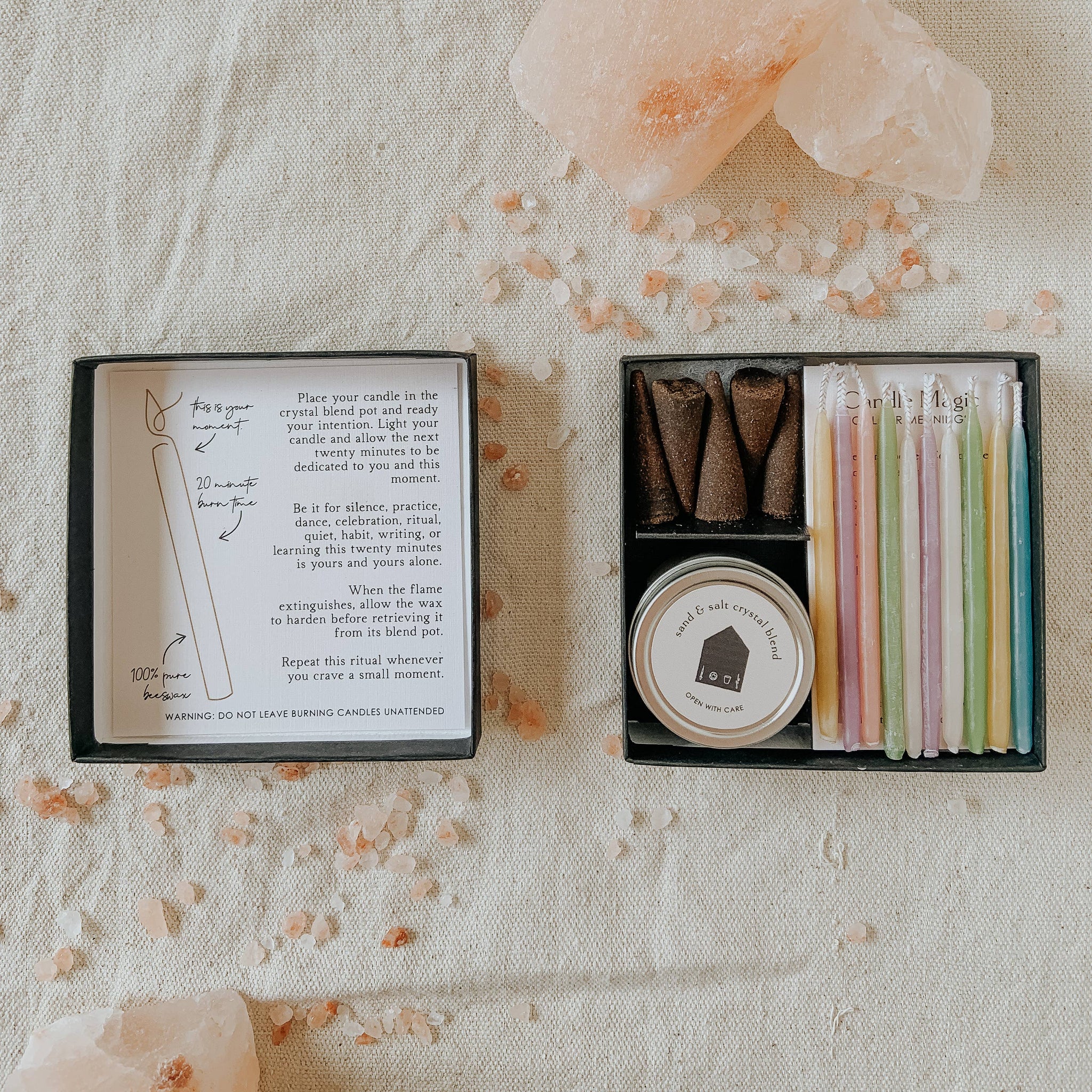 One of the most special aspects of these kits is the salt crystal blend that keeps the candle secure and allows it to burn right down to its end.