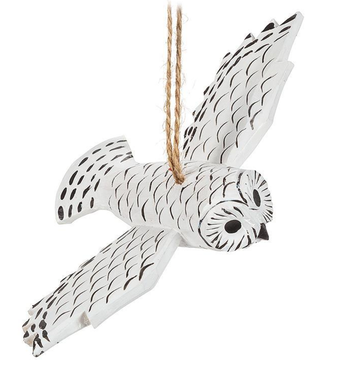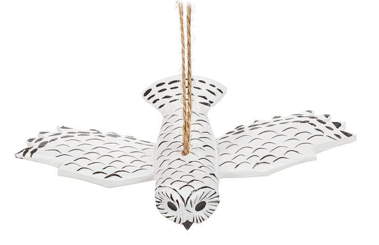 Bring a fun and folksy touch to your holiday decor with this carved Flying Snowy Owl Ornament. Hand-crafted and hand-painted out of wood, the rustic carving of this forest fowl in flight makes for a cool and feathery complement to any Christmas tree. Other carved wooden ornaments also available.