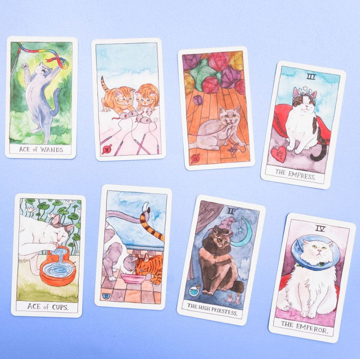 A guidebook accompanies the 78 tarot cards, revealing how to learn from your cat’s wisdom