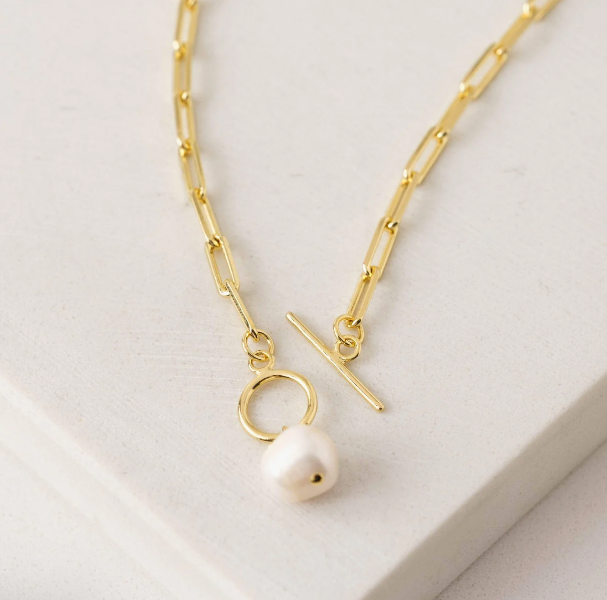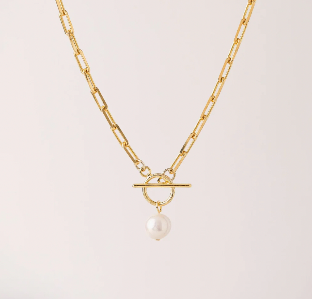 Gracefulness embodied. The timeless curb chain holds a single freshwater pearl at the centre and is finished with a toggle clasp.