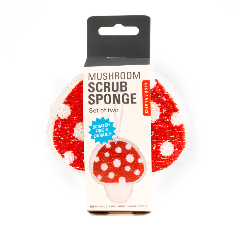 A delightful pair of mushroom-shaped scrubbing sponges designed for kitchen efficiency. These dual-sided cleaners tackle stubborn residue on all dinnerware and cookware without causing surface damage. The abrasive scrubbing surface delivers powerful cleaning action, while the integrated nylon loop allows convenient storage between uses. Ideal for households seeking reliable, whimsical dishware maintenance solutions.